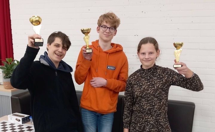 Nog even de Zutphense bekerwinnaars van de Grand Prix van afgelopen week op de foto: in het midden Ruud Geelen (winnaar Groep D), links Dylan Vening (nr. 2 in Groep A) en Magalie Meijerink (nr. 3 in Groep G). Goed gedaan! Met een beetje meer geluk van Nathan, Bas, Lloyd en Maurits in de laatste ronde hadden we nog meer bekers in Zutphen kunnen houden. En voor Kjeld die na een goed begin ziek uitviel halverwege het toernooi, had er misschien ook nog wel een beker ingezeten…