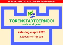 14e TorenstadtoernooiOp zaterdag 4 april 2026 organiseren we voor de veertiende keer het Torenstadtoernooi. Ook voor de jeugd is het een interessant toernooi om mee te doen. (uitslagen)Programma:Zaal open 9:30 uur8 ronden zwitsers,…