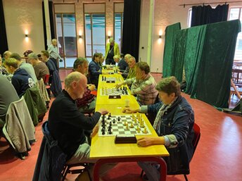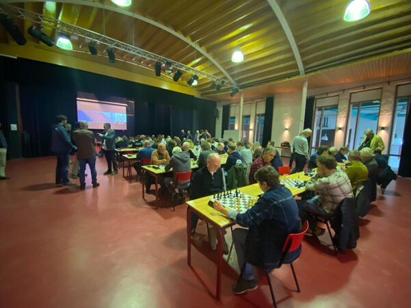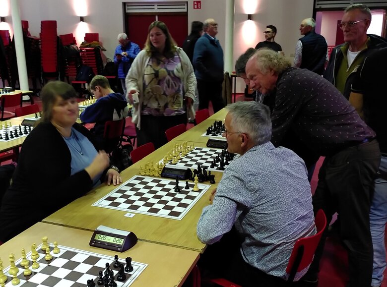 Over het schaken zelf: we treden na enig beraadslagen vooraf aan met een 1e en 2e op sterkte en dus met het 3e team vol jeugdspelers. Ons eerste vliegt door de eerste 4 ronden heen zonder puntverlies en met een indrukwekkend aantal bordpunten. Het 3e team verslaat verrassend ons 2e en zal later knap boven hen eindigen in de middenmoot. Ik speel in ronde 3 tegen een clubgenote uit dat 3e team genaamd Leonie, die nog nooit het Lettisch gambiet heeft meegemaakt en die na 1 e4 e5; 2 Pf3 f5 komt met een nieuwtje in de vorm van 3 Ld3… Het gevolg wordt een grote chaos, want ik win weliswaar dat stuk, maar mijn koning komt lelijk op de tocht. Uiteindelijk lukt het me het punt binnen te halen, maar het talent van haar is onmiskenbaar.