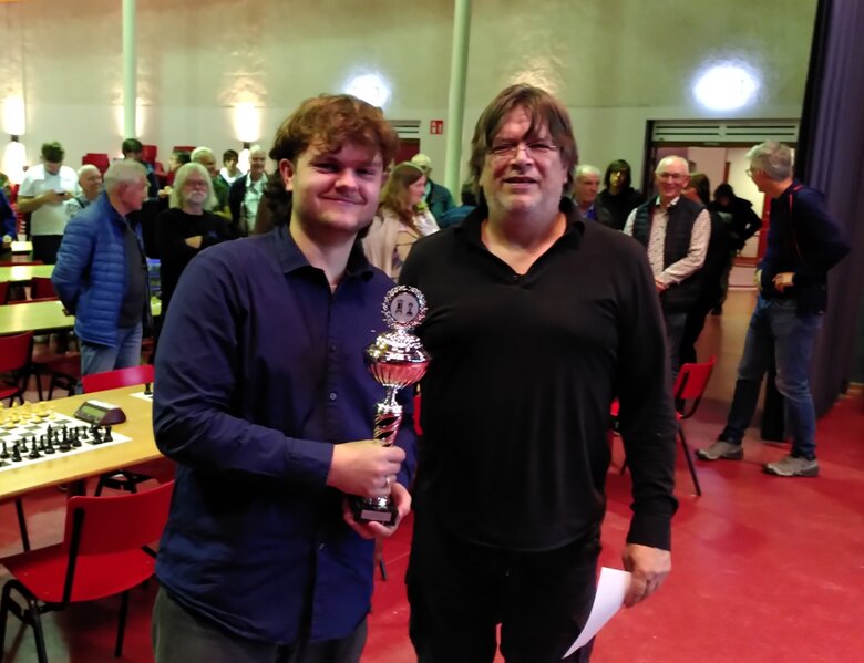Na de pauze mogen we met het 1e team tegen het ijzersterke Winterswijk 1 en 2. Net als vorig jaar heeft deze sportieve club besloten om de teams zo in te delen dat ze ongeveer even sterk zijn. Want anders zou hun 1e weleens al te gemakkelijk de beker kunnen pakken gezien hun hoge ratings. Langs diverse afgronden bereiken we tegen beide teams een 3-3 score en op de eerder vergaarde karrenvracht aan bordpunten winnen we zowaar het toernooi. We hebben ook een sportheld in de vorm van Joris die alle potjes vandaag heeft gewonnen! Hij mag dan ook de imposante beker in ontvangst nemen, de wat kleinere versies gaan mee naar de plaats die nog steeds het superscherpe record voor de laagste temperatuur ooit in Nederland in handen heeft ( op 27 januari 1942: -27,4 graden). Toen bestond de schaakvereniging aldaar zelfs nog niet, want komend jaar wordt het 80-jarig bestaan gevierd en zal Winterswijk daarom de 42e editie organiseren!