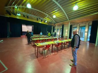 De catering wordt vandaag verzorgd door een mavo-examenklas van de school onder regie van Inge als beheerder van de kantine en Tiemen Klopstra als mentor. De in mooi zwart en wit uitgedoste leerlingen en mentor presenteren vele soorten taart en ook wordt er in het verzorgingslokaal hard gewerkt aan het warme middageten…tot de stroom uitvalt en het hele proces stokt. Gelukkig is conciërge Veron paraat en na enig technisch geworstel doet alles het weer. Dat betekent wel dat de warme maaltijd gaat plaatsvinden na de 4e in plaats van de 3e ronde. Het eten wordt daardoor om twee uur zo gretig aangevallen door de uitgehongerde schakers dat er helaas wat te weinig vegetarische en carnivore worstjes blijken te zijn. En de groene boontjes leiden tot menig discussie: door het mankement zijn ze weinig doorkookt, wat modern is en geheel naar mijn smaak en ook die van Roel en diverse anderen. Maar mensen die nog zweren bij grootmoeders pot uit de jaren ‘50 – toen alles zo lang werd gekookt dat kauwen onnodig was- klagen over de arbeid die nu geleverd moet worden met hun slap gevormde kaken.