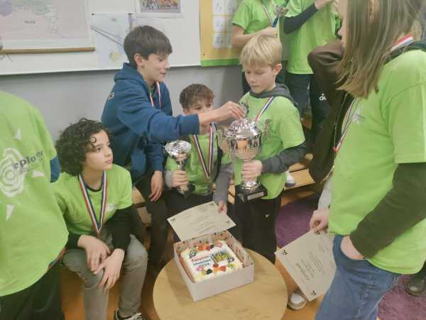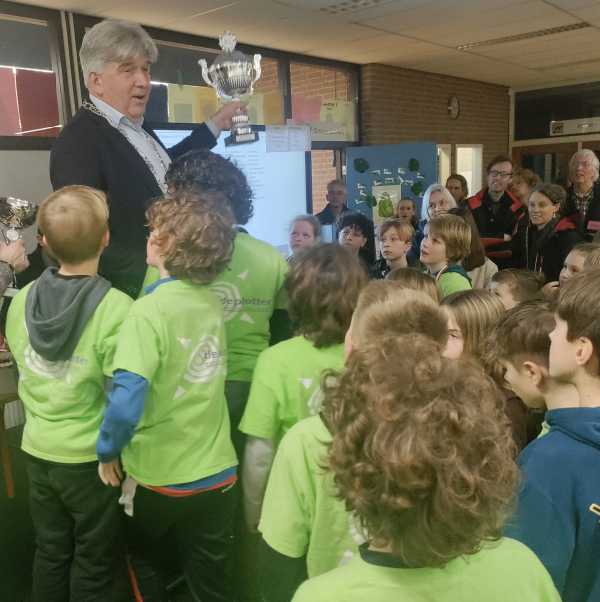 Alle spelers kregen een medaille, alle teams een beker en een deelname-certificaat. De grootste beker ging uiteraard naar het team van De Plotter 1, die ook nog de immense wisselbeker mee terug mocht nemen en last-but-not-least de traditionele kampioenstaart die Bakkerij van Zuijlen beschikbaar had gesteld. De aanmoedigingstaart uit dezelfde Bakkerij zag er al net zo smakelijk uit en ging naar de Achtsprong 3. Als extraatje kregen alle deelnemende scholen een schaakset (bord+stukken); deze konden we beschikbaar stellen dankzij de extra inkomsten die we hebben ontvangen naar aanleiding van de Zutphense Zetjes-actie.