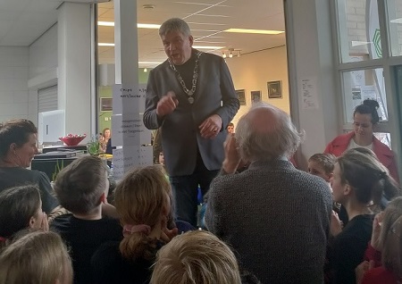 Een leuk intermezzo tijdens het toernooi was het bezoek van Wimar Jaeger, de nieuwe Zutphense burgemeester. Hij zou eigenlijk de prijsuitreiking doen, maar druk-druk-druk… Dus bleef het bij een praatje en een openingszet aan een van de borden. De burgemeester toonde zich blij verrast door al die schakende kinderen en zei dat hij toen hij een jaar of 12 was zelf nog aan het schoolschaken heeft meegedaan en dat hij ook verscheidene schaakdiploma’s heeft. Ook nu schaakt hij nog weleens een potje. Hij vertelde ook dat hij in zijn leven ook een enorme verzameling schaakspelen heeft opgebouwd. Daaronder een 18e eeuws kussenvormig bord met insteekschaakstukken: dat was speciaal bedoeld om in hotsebotsen koetsen toch te kunnen schaken (hoe het hotsebotsen op een 18e eeuwse onverharde weg in zijn werk ging, wist de burgemeester zeer plastisch uit te beelden😉). Hij beloofde volgend jaar dat schaakspel mee te nemen en er tegen het winnende team een potje op te spelen. Daar houden we hem aan en we gaan ook kijken naar een gelegenheid om de rest van zijn verzameling te zien te krijgen.
