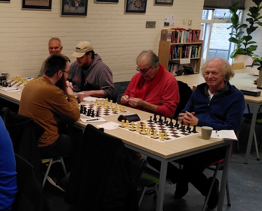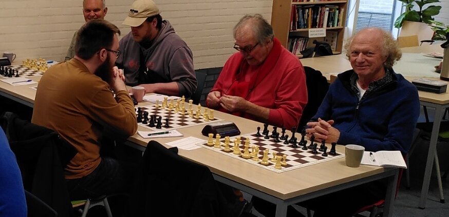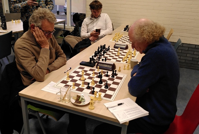 Zoals altijd was René als laatste bezig. In een onregelmatige opening verzuimde wit stukwinst. Er ontstond een voordelig eindspel voor zwart. Na nog een gemiste remise kans door wit werd zwart matchwinner. (zie partij 5-3)