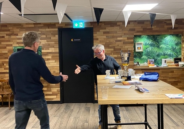 Door een actie met h6 en g5 op de Koningsvleugel win ik daar veel ruimte, maar met de open h-lijn waar ik onterecht mijn aandacht op richt kan ik niks beginnen, waarna een grote ombouw naar de damevleugel vereist is. Jeroen heeft een wild paard dat het hele bord zal zien en uiteindelijk sneuvelt op c5, ten koste van mijn sterkste loper. De remise is onvermijdelijk. En Jeroen wint de A-groep nu met meer weerstandspunten dan de ex-aequo op 4.5 geëindigde oud kampioen Fokke Jonkman. Hij mag verdiend de imposante Jacques van Gelder beker die nog groter is dan de Wereldcup van de FIFA een jaar op de schoorsteenmantel (heeft iemand eigenlijk nog zoiets gedateerds in huis?) zetten…Hij kan het kolossale ding wellicht amper optillen, maar dat hoeft vandaag ook niet, want zijn naam zal er nog in worden gegraveerd.
